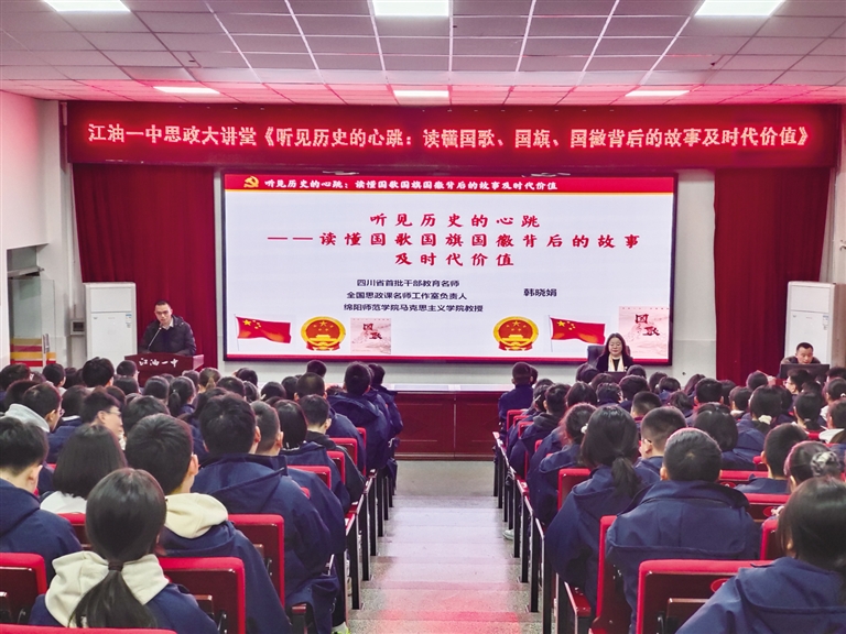 12月1日下午,学校特邀绵阳师范学院马克思主义学院院长、硕士研究生导师韩晓娟教授开展题为《听见历史的心跳:读懂国歌、国旗、国徽背后的故事及时代价值》的思政大讲堂。讲座以线下与直播同步的方式进行,高一班级代表在现场聆听,其余班级在教室收看实时直播。韩教授通过生动讲述国家象征背后的历史脉络与精神内涵,帮助学生在庄严仪式感中深化对民族精神与国家意义的理解。