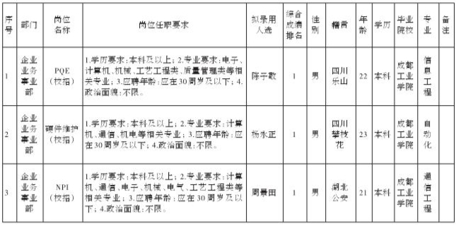 根据四川九州电子科技股份有限公司发布的招聘公告及招聘相关规定,经测试、考察、体检等程序,拟录用陈子敬等3名同志到四川九州电子科技股份有限公司工作,现予以公示,具体情况如下: